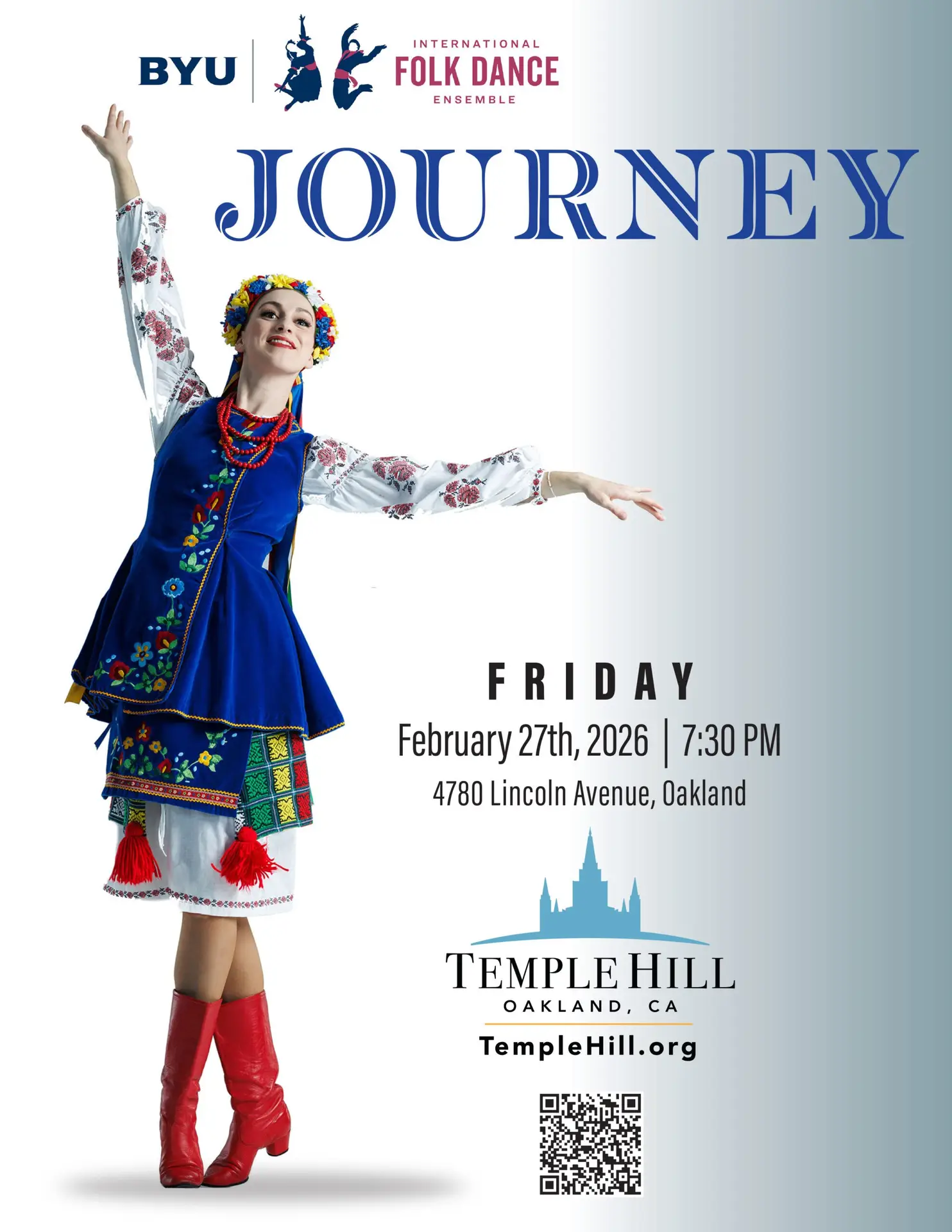 All are welcome to join us in the Temple Hill Auditorium on Friday, February 27th, at 7:30 PM for this cultural celebration of music and dance by the BYU International Folk Dance Ensemble. Through a variety of dances—American clogging, Irish step dance, Indian folk fusion, Ukrainian hopak, and more, this group is sure to delight and inspire!
