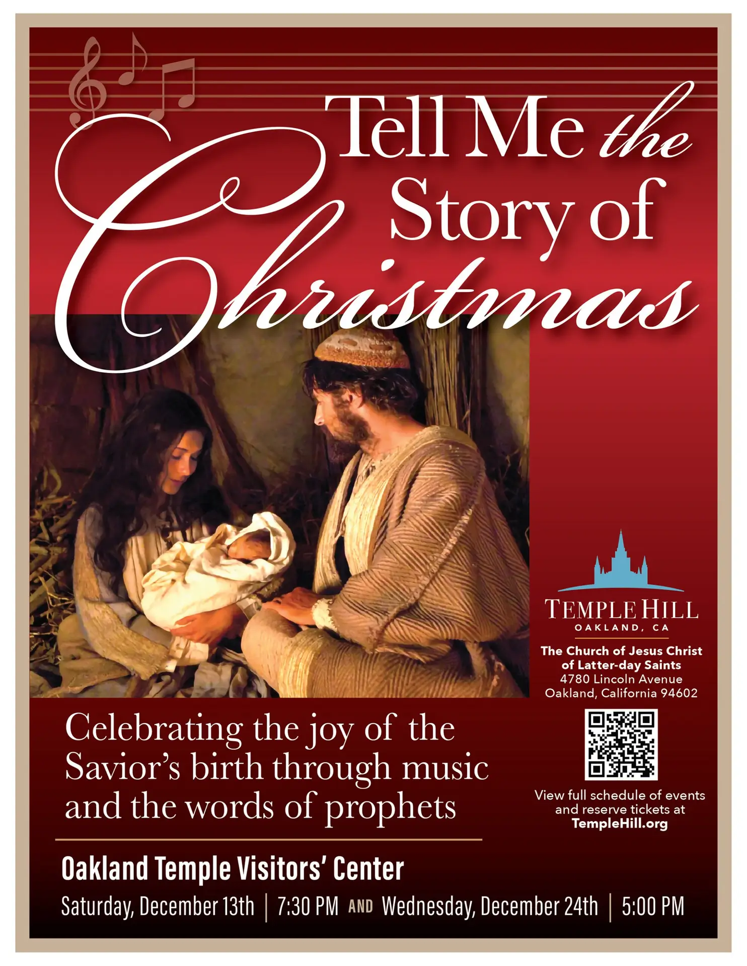 Venga a animarse con esta inspiradora narración de la verdadera historia de la Navidad el 24 de diciembre a las 17:00 h en el Centro de Visitantes del Templo de Oakland. Sumérjase en el mensaje navideño mientras los misioneros del Centro de Visitantes del Templo de Oakland presentan la historia del nacimiento del Salvador a través de las Escrituras y la música.