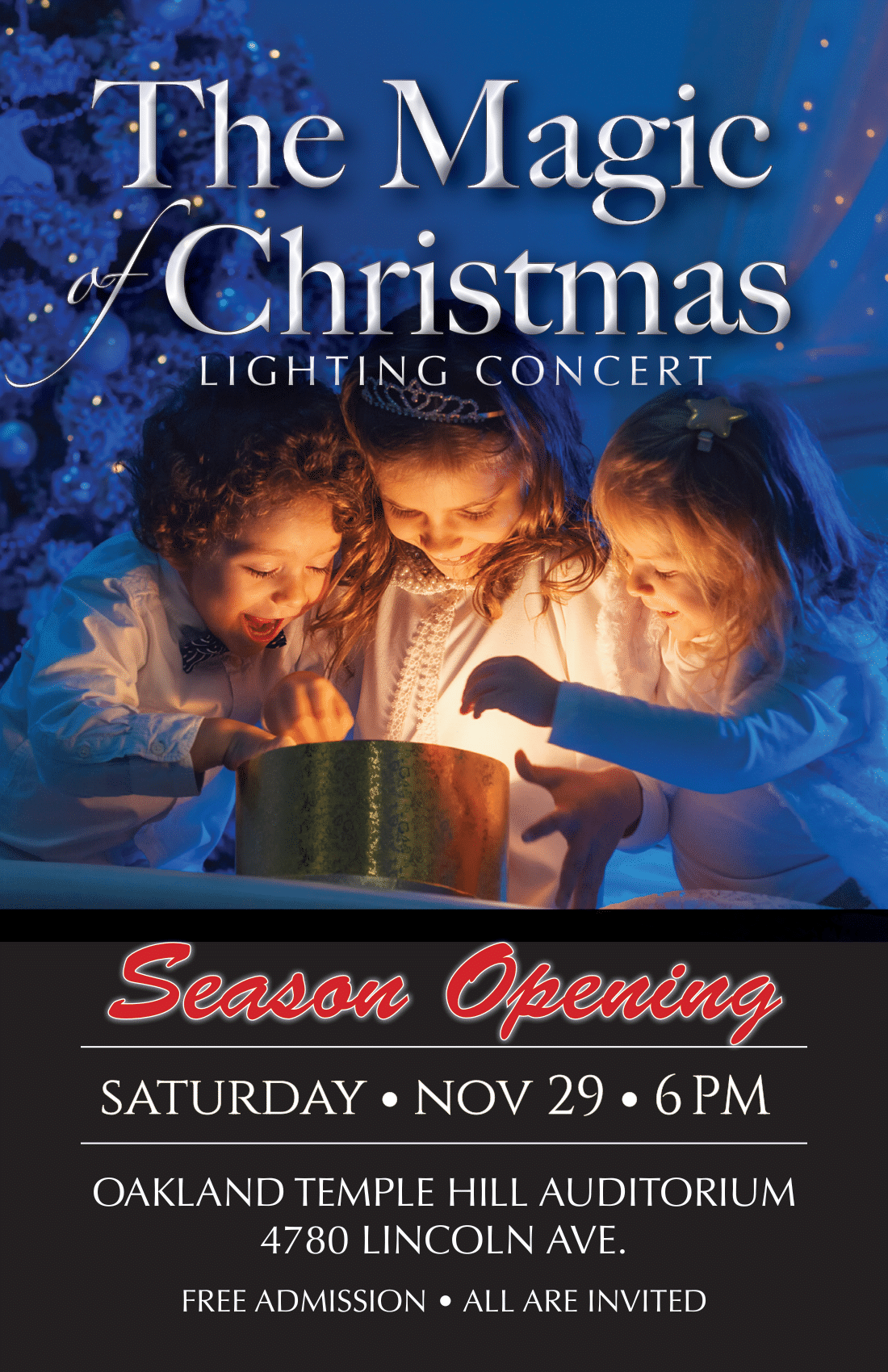 Magic of Christmas will feature soloists, the Temple Hill Choir, orchestra, and dancers to open the traditional Christmas lighting concert on Oakland’s Temple Hill, and will include audience sing-alongs with the Temple Hill Choir!