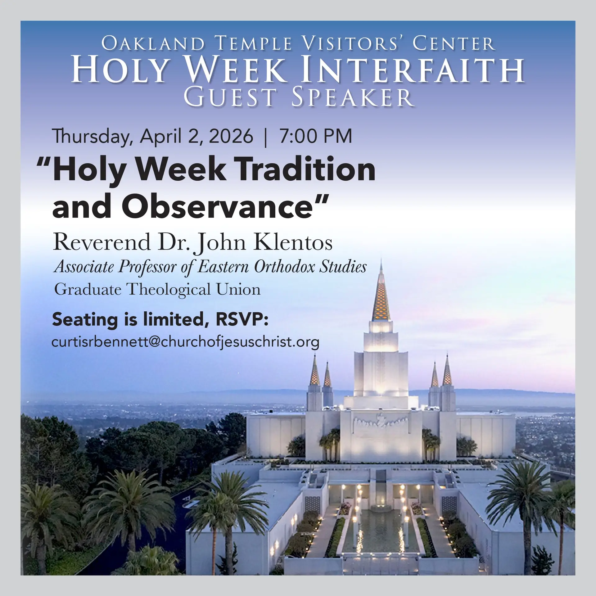 Join us in the Oakland Temple Visitors’ Center for our Holy Week interfaith guest speaker series.