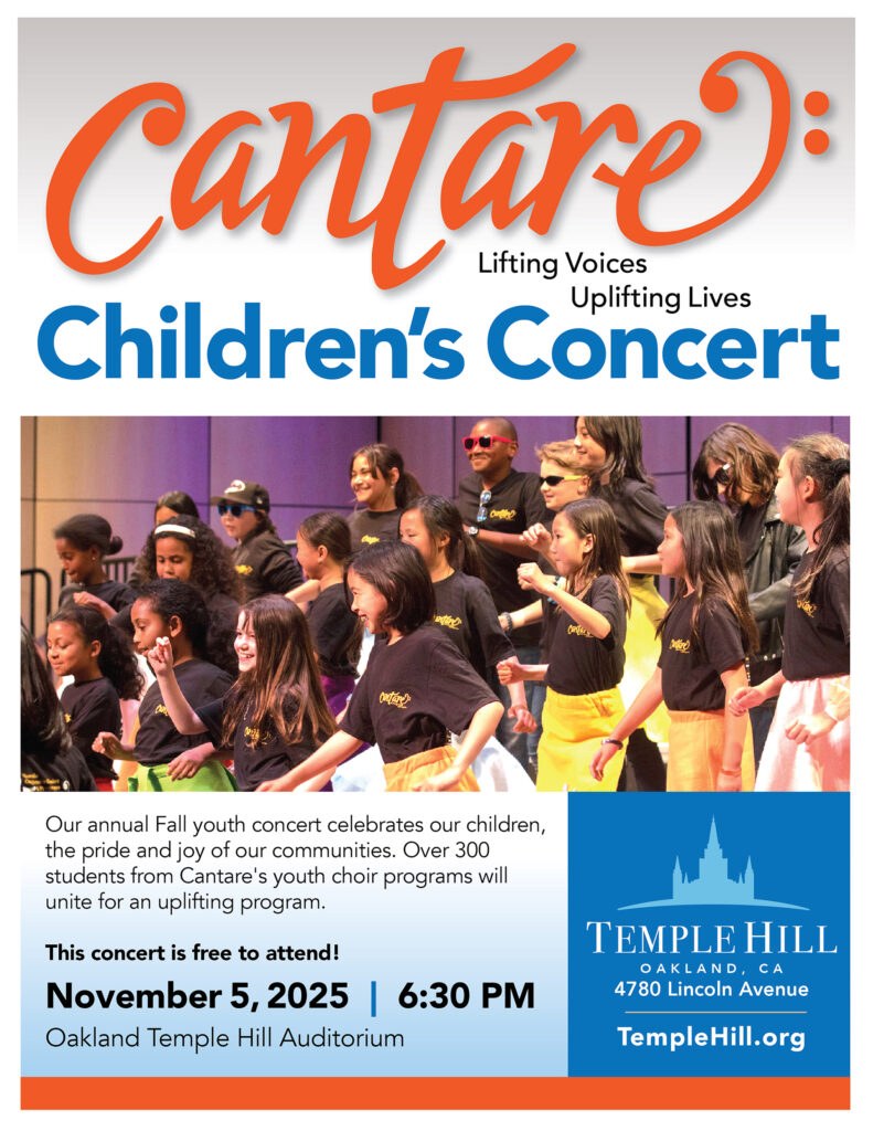 Please join us on November 5 at 6:30 PM in the Temple Hill Auditorium for a joy-filled concert celebrating the children and youth of Oakland—the pride and joy of our community! You’ll have the chance to sing, dance, and clap along to music from around the world. Over 300 students from Cantare’s after-school choir program will inspire and uplift you with their performances. This event is free of charge; no tickets are required.