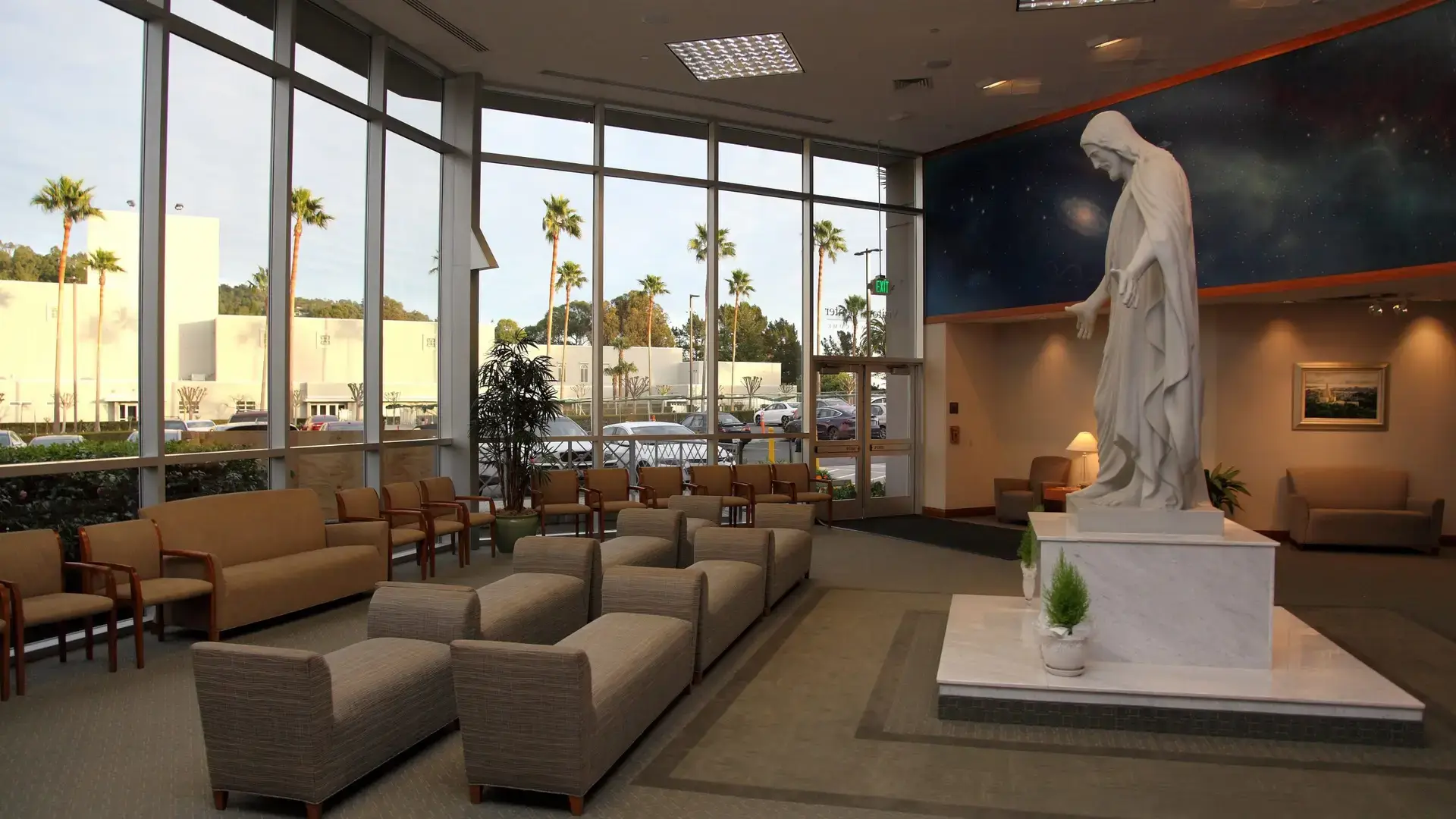 Whichever building you are visiting, you will walk through the beautiful and charming temple grounds. Throughout the year, there are a variety of beautiful flowers. There are also tall palm trees lining both sides. Through the center of the garden are sparkling fountains and connecting water features, symbolizing the living water given by Jesus Christ to the world. Many people like to stroll, walk their dogs, or relax on the quiet paths. Directly in front of the temple is a calm reflection pool. The water in the pool comes from the grand waterfall on the front wall of the temple. On either side of the waterfall are stairs that lead up to the eye-opening roof garden, with a 360-degree view around the temple, and a panoramic view of the Bay Area, including San Francisco, the city of Oakland, the Golden Gate Bridge, and the coast. In the evening, the temple grounds offer a magnificent view of the sunset overlooking the bay.